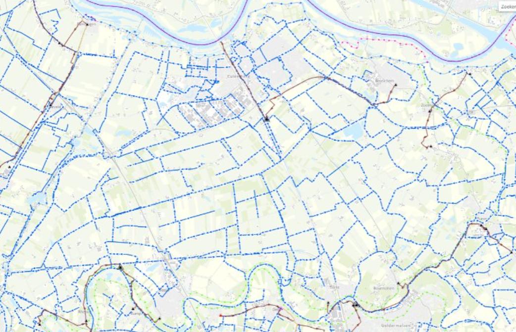Dijk, sloot en riool zijn de drie taken van het Waterschap. Op de kaart zie je het huidige watersysteem: er zijn grote watergangen die door het waterschap worden onderhouden. Het waterschap beheert ook de zomer- en winterdijken van de Lek en Linge. De Diefdijk is een bescherming van Holland tegen het water dat naar het laagste punt in Culemborg is gelopen. Nu zijn er wat gaten zoals de A2 die risicovol zijn (een coupure die jaarlijks wordt uitgetest). Ook het rioolstelsel is op deze kaart te zien (gemeentelijk en daarna, gezuiverd door het waterschap, naar de Lek).
