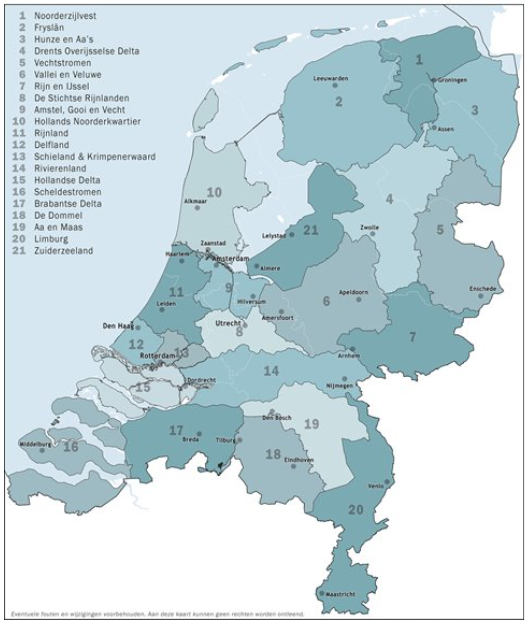 Waar zit Rijkswaterstaat en waar het waterschap. Grote rivieren is Rijkswaterstaat. Uiterwaard en stroomvlakte hoort daarbij (nevengeulen, kleiwinning). De uiterwaard eindigt waar de dijk begint: de helling is al waterschap; de polder er achter en de volgende dijk: is allemaal waterschap.